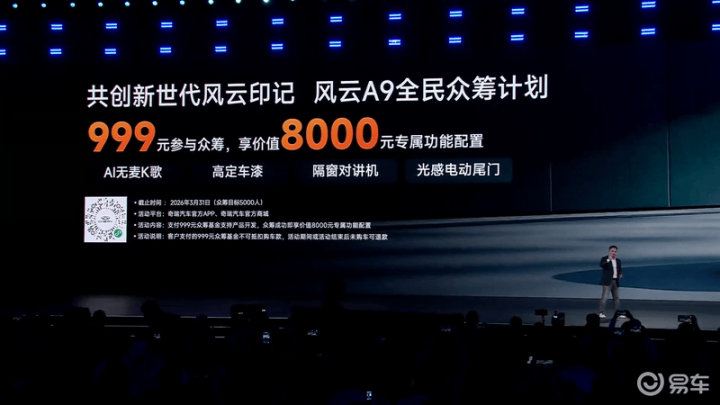 易车讯1月17日,在2026奇瑞汽车AI之夜活动中,奇瑞风云A9正式亮相,同时新车开启全民众筹计划,目标5000人,用户可999元参与众筹,享价值8000元专属功能配置。新车定位为新世代智美轿跑,搭载诸多AI智能技术。